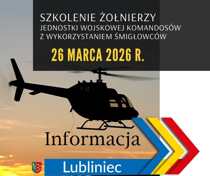 Nad Lublińcem i okolicą tego dnia będzie widać wojskowe śmigłowce, bo zaplanowano tu szkolenie z ich udziałem. Jednostka Wojskowa Komandosów poinformowała, że działania obejmą teren Jednostki Wojskowej 4101 oraz powiat lubliniecki. Loty mają odbywać się wyłącznie w dzień i zgodnie z zasadami bezpieczeństwa obowiązującymi przy zadaniach lotniczych.